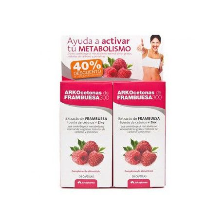 ARKOcetonas de Frambuesa 300 es un complemento alimenticio base de extracto de frambuesa y zinc que contribuye al metabolismo normal de las grasas, hidratos de carbono y proteínas.