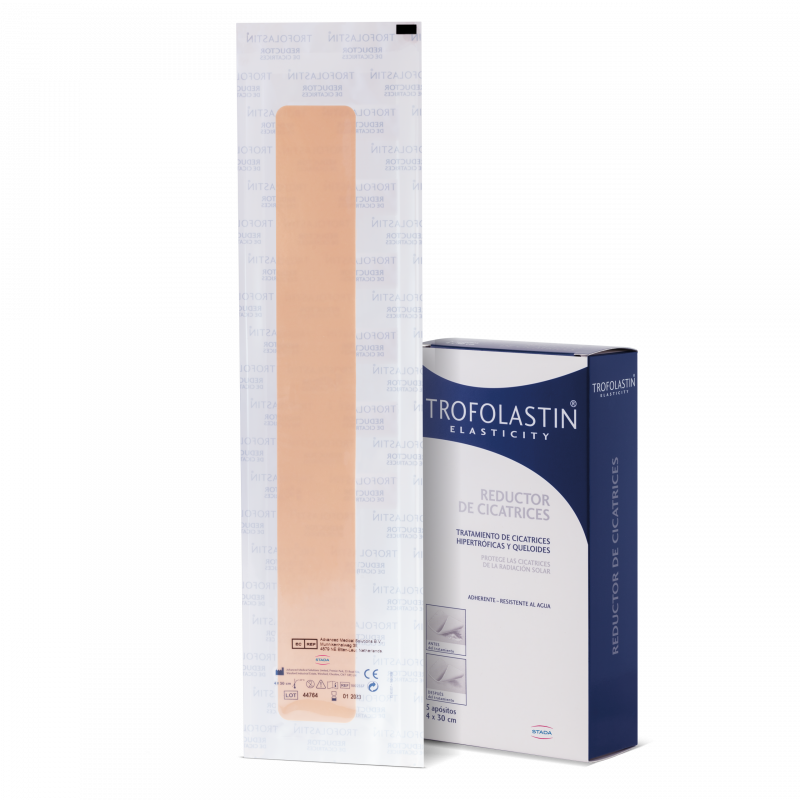 | Limpiar y secar cuidadosamente la zona de la cicatriz para facilitar la aplicación de Trofolastín reductor de cicatrices. Colocar el apósito encima de la cicatriz asegurándose de que sus bordes se encuentran fijados en la piel. El apósito se puede recortar adaptándolo a las dimensiones de la cicatriz. Puede mantenerse fijado en la superficie de la piel 24 horas al día. Es resistente al agua y, por tanto, puede estar hasta cinco días continuamente adherido. Es recomendable mantenerlo al menos 12 horas cada día en contacto con la cicatriz aunque cuanto menos sea el tiempo de contacto con la cicatriz más larga será la duración del tratamiento. Puede retirarse para la higiene diaria y reutilizar el mismo apósito durante varios días. Cuando se observe que pierde adherencia sustituirlo por uno nuevo. |